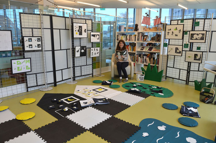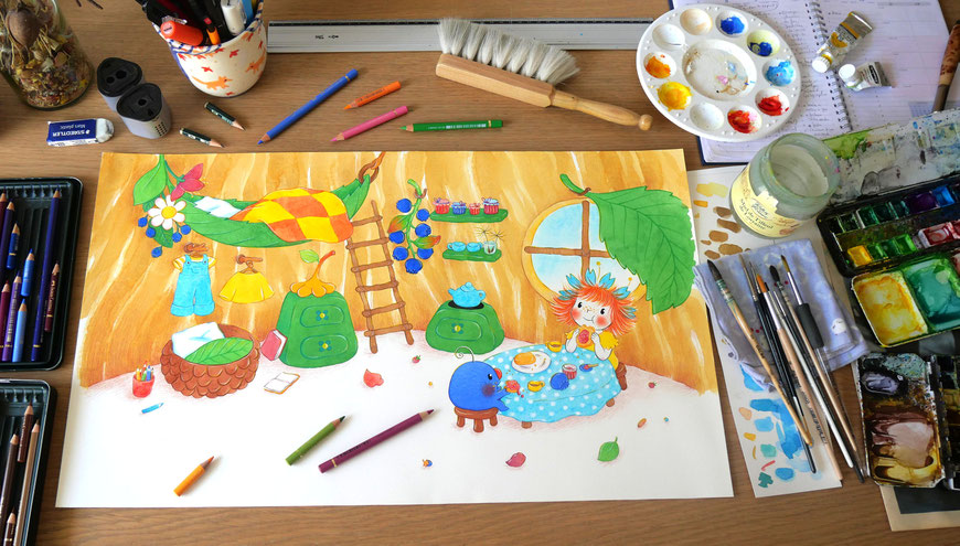 Travaillant de manière traditionnelle, je propose également des expositions autour de mes ouvrages pour y présenter les originaux, le story-board, les recherches... De quoi immerger petits et grands dans un monde coloré et poétique, tout en leur permettant de mieux comprendre les coulisses d'un livre illustré.