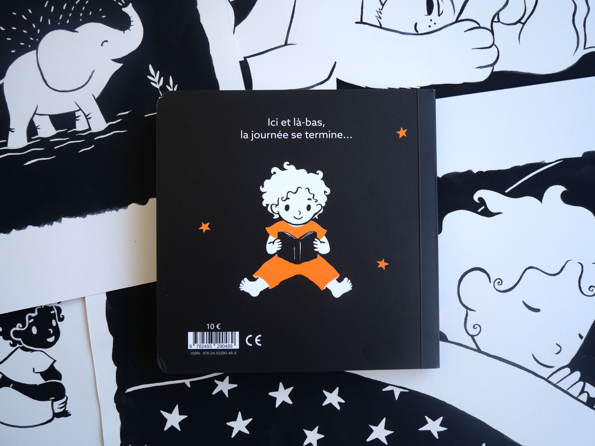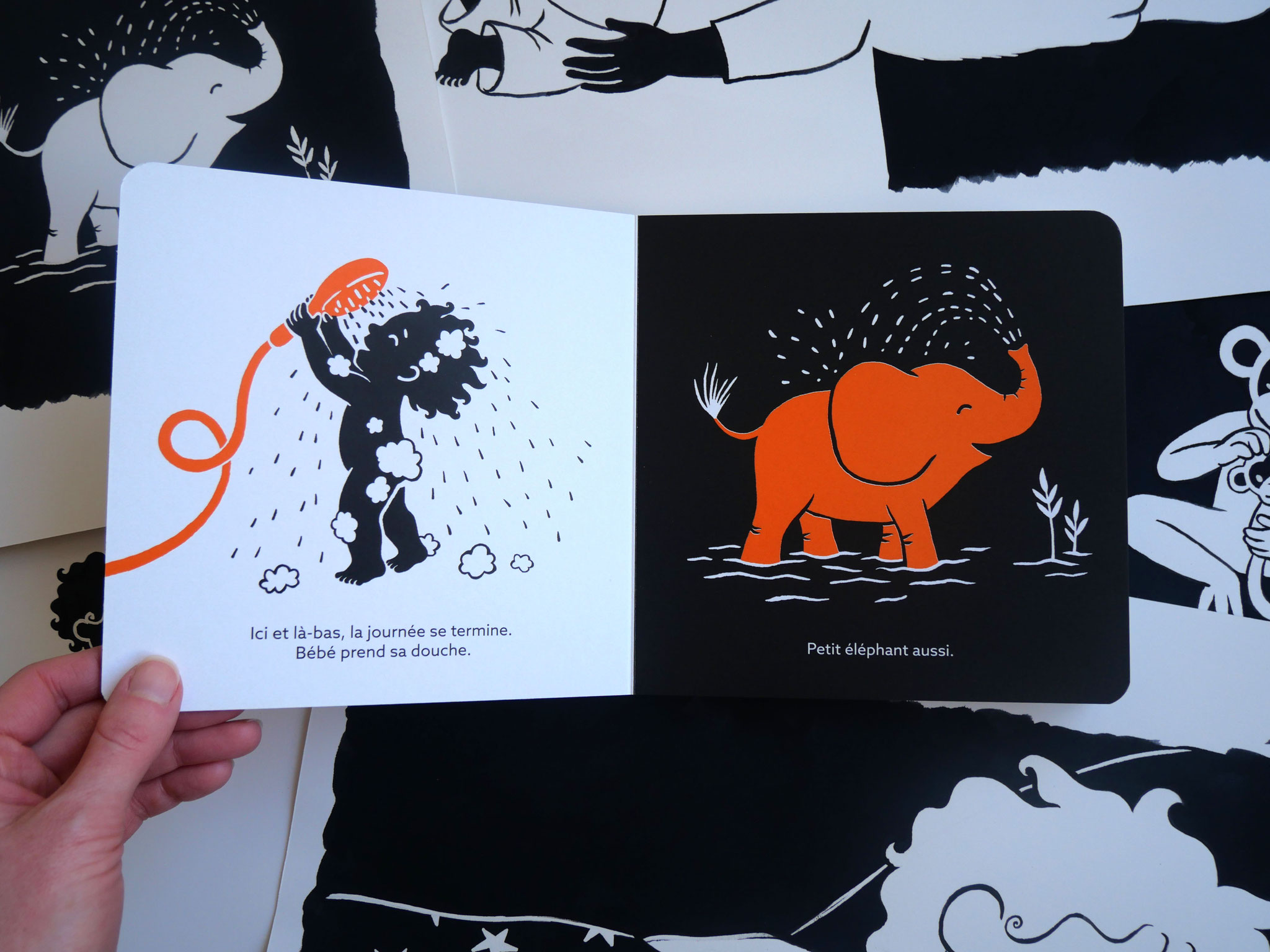Bébé prend sa douche. Petit éléphant aussi. Bébé écoute une histoire. Petit perroquet aussi. Ici et là-bas, la nuit est là. Chut... Tout le monde rêve déjà !