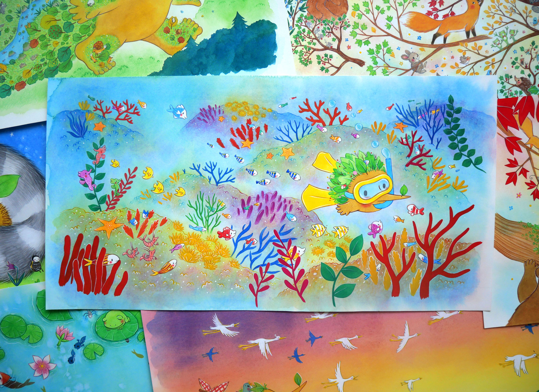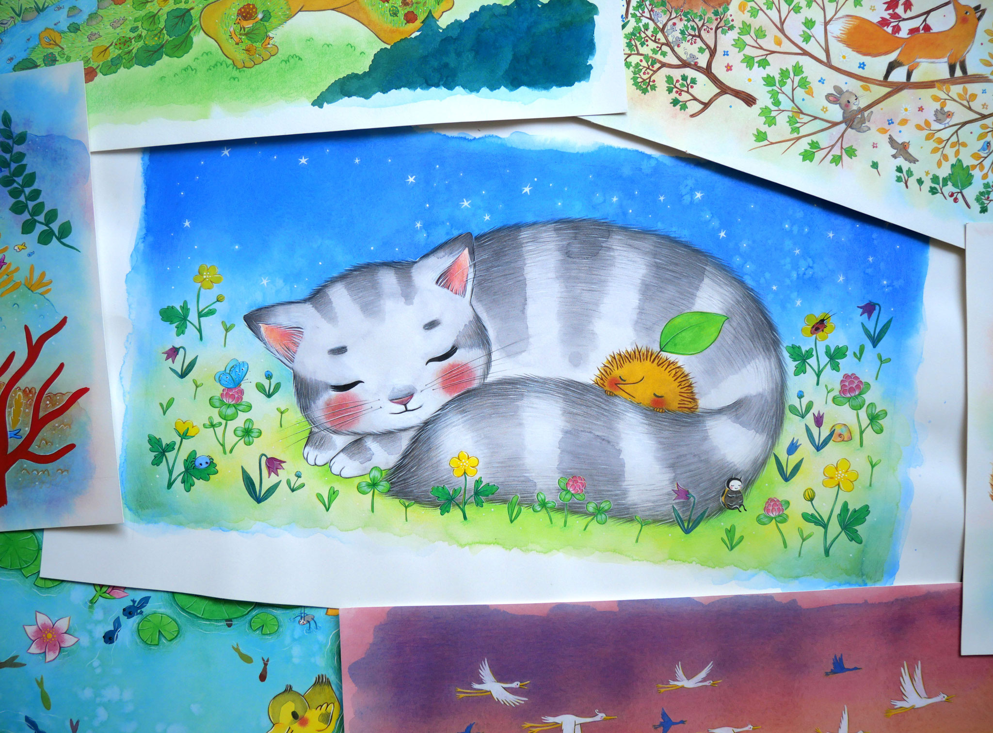 Travaillant de manière traditionnelle, je propose des expositions autour de mes ouvrages pour y présenter les illustrations originales, le story-board, les croquis de recherches... De quoi immerger les visiteurs dans un monde coloré et poétique, tout en leur permettant de mieux comprendre les coulisses d'un livre illustré.