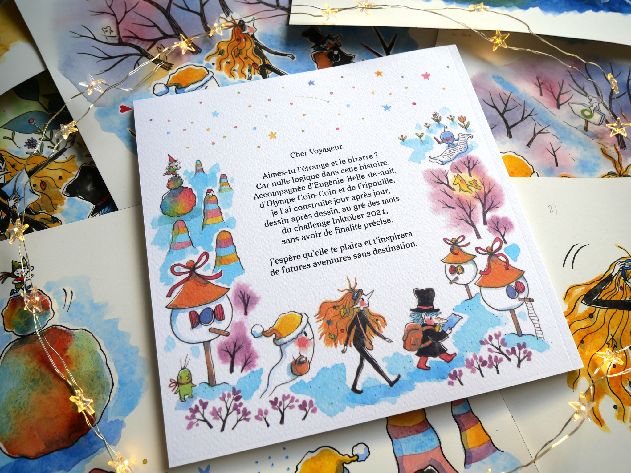 Un recueil regroupant toutes les illustrations réalisées lors du challenge Inktober 2021, racontant les aventures déjantées et fantaisistes de deux personnages : Eugénie Belle-de-nuit et Olympe Coin-Coin.